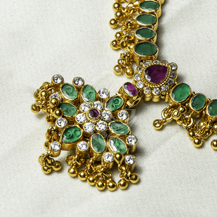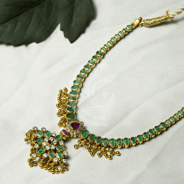 Graceful temple-style necklace adorned with emerald stones, intricate motifs, and a statement pendant, perfect for weddings and traditional occasions.