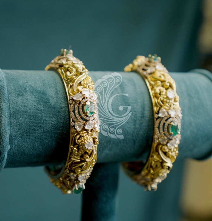 Antique carved bangles with emerald center stones, intricate motifs, and sparkling accents, perfect for weddings and grand traditional occasions.