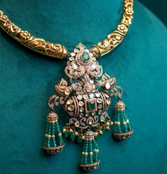 The Antique Nakshi Pendant Necklace Set is a refined expression of traditional craftsmanship, highlighted by its intricately detailed pendant and textured neck band. The subtle antique finish enhances its heritage appeal, while the emerald bead drops add graceful movement and charm. Designed to complement classic sarees and festive attire, this piece offers a perfect blend of elegance and cultural richness. Ideal for weddings, celebrations, and special occasions, it stands as a timeless jewellery statement rooted in traditional artistry and sophisticated design.