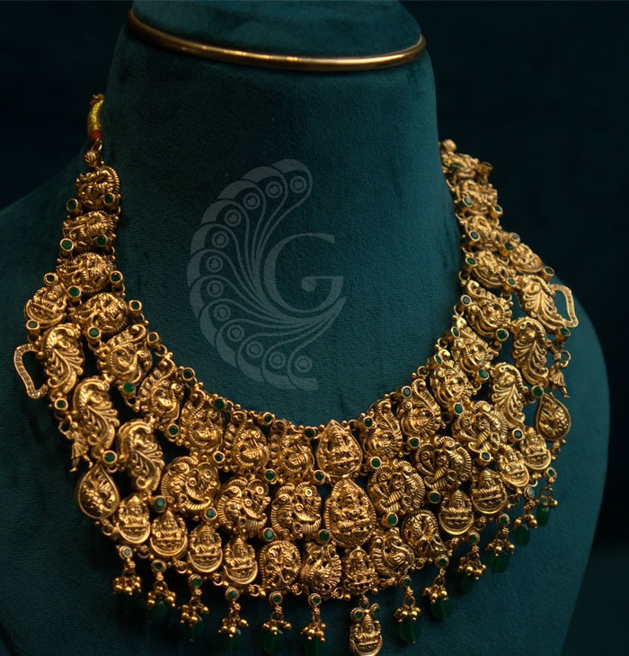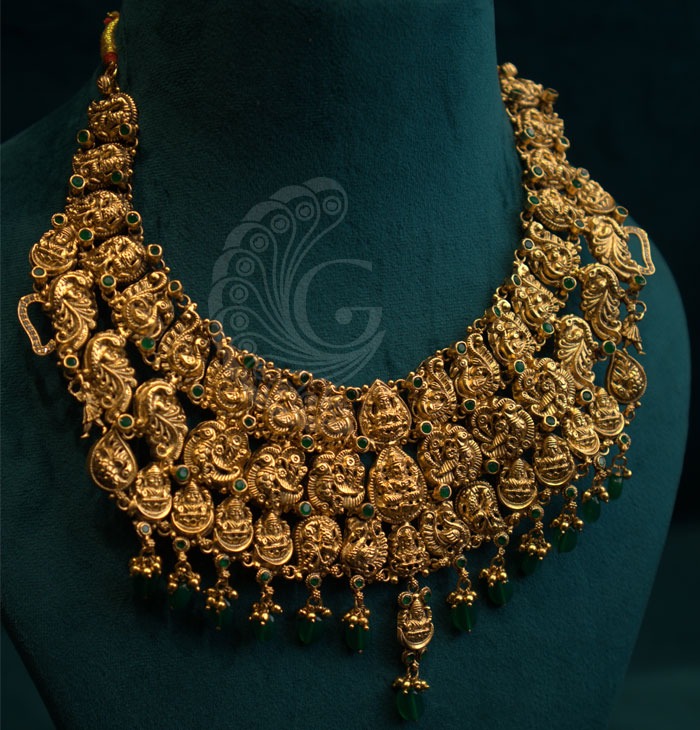 Traditional temple coin necklace featuring multiple deity motifs, intricate carvings, and elegant drops, perfect for weddings and grand festive occasions.
