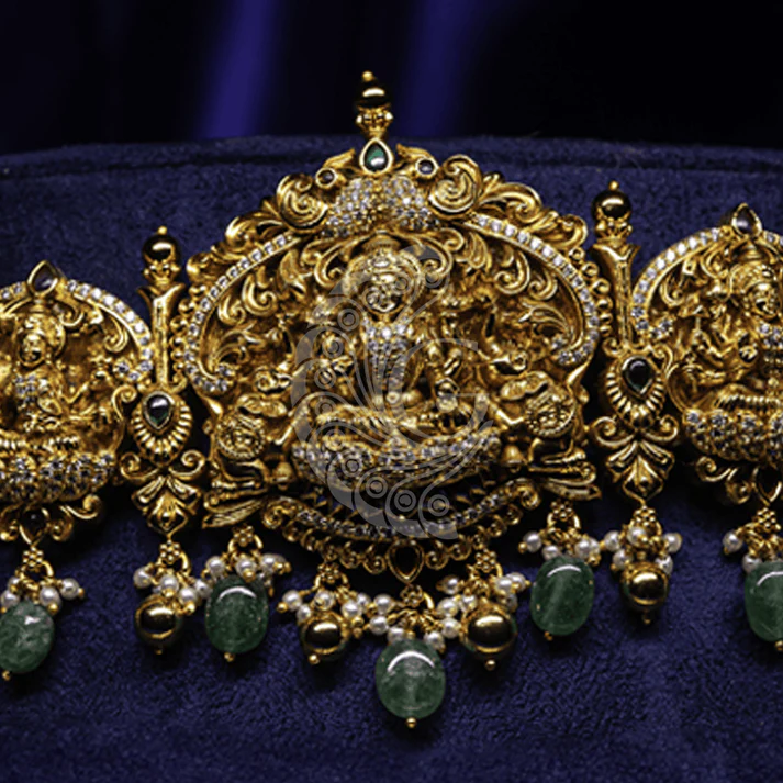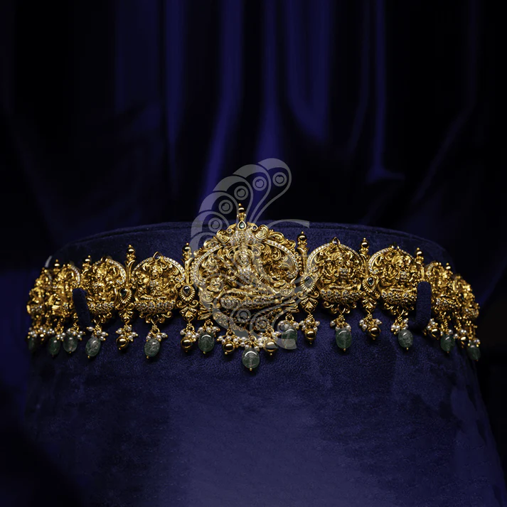 The Ashta Lakshmi Temple Vaddanam is a magnificent bridal waist belt inspired by traditional South Indian temple jewelry. Featuring detailed carvings of the eight forms of Goddess Lakshmi, this piece represents prosperity, strength, and divine blessings. The antique gold finish enhances its intricate artistry and regal presence. Perfect for weddings and grand celebrations, this vaddanam beautifully complements silk sarees and bridal attire, adding a majestic and culturally rich statement to your overall look.