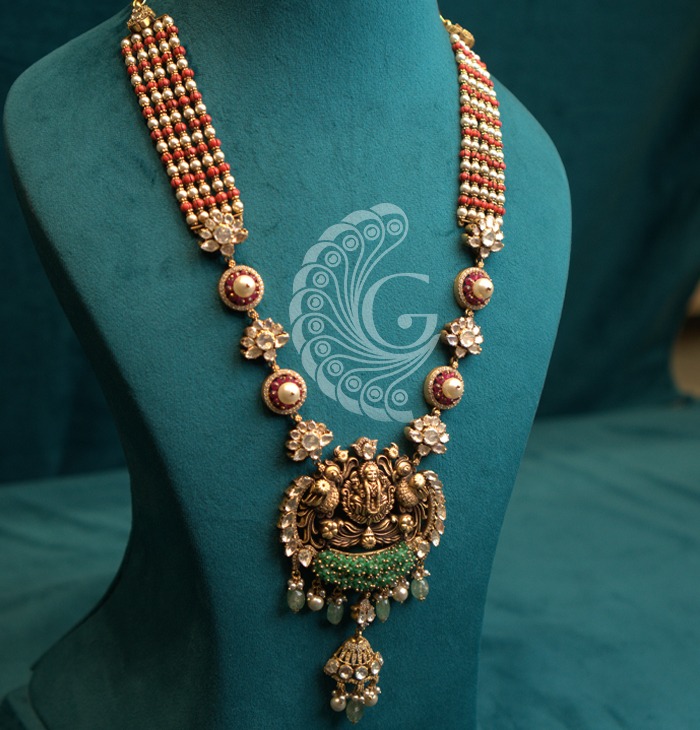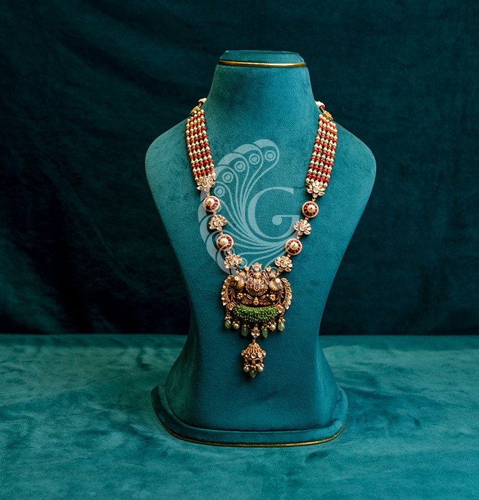Long necklace featuring dual bead strands, floral connectors, ornate pendant, and green bead drops, perfect for festive and traditional occasions.