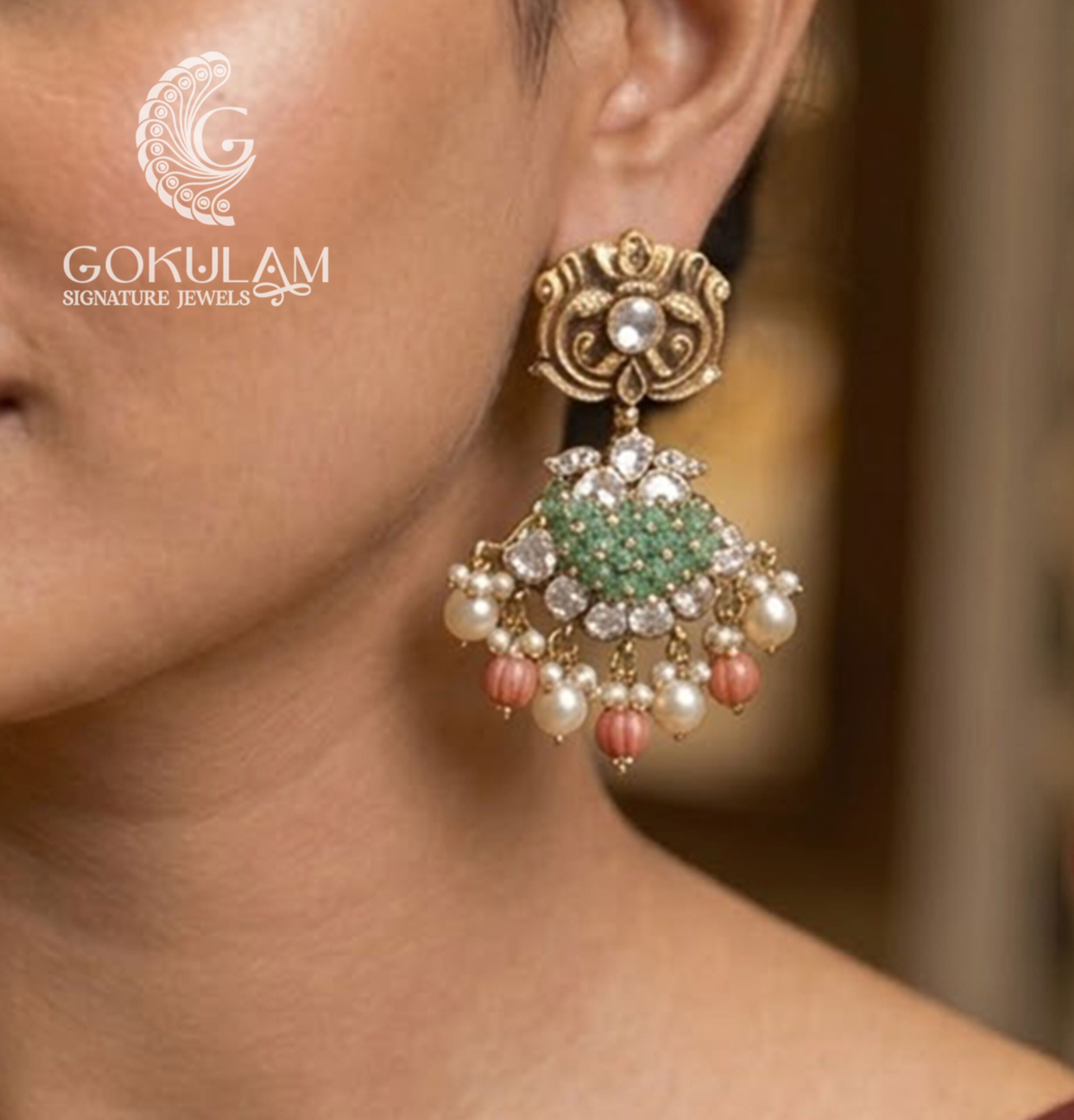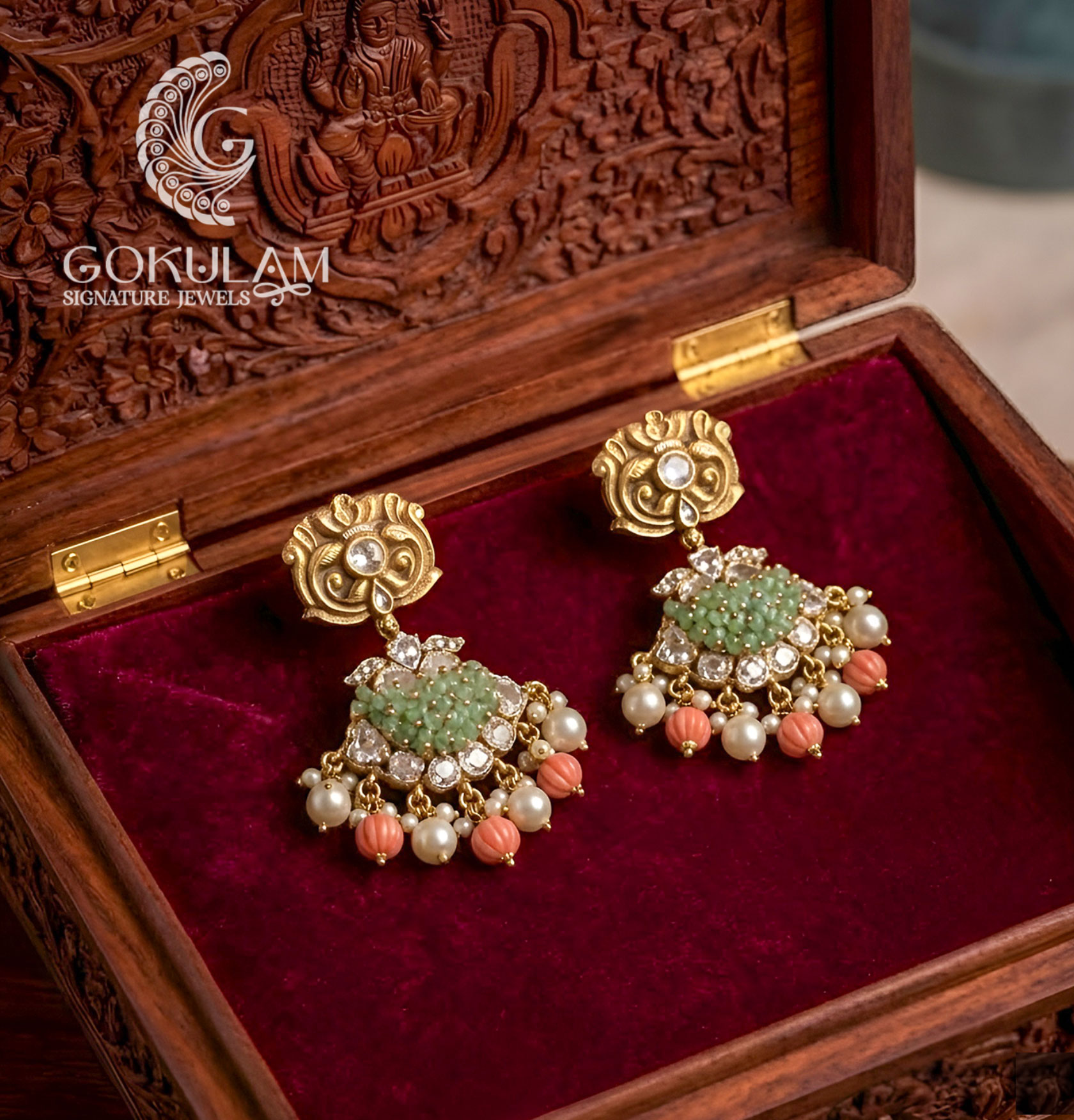 The Emerald Pearl Jhumka Earrings are a beautiful blend of traditional craftsmanship and elegant design. Featuring a classic gold-toned stud with intricate detailing, the earrings are adorned with sparkling kundan stones and delicate green beadwork at the center. The lower jhumka section is enhanced with graceful pearl and coral-toned bead drops, creating a rich and festive look. Perfect for weddings, festivals, and traditional celebrations, these earrings add timeless charm and sophistication to ethnic outfits, making them an essential addition to any jewellery collection.
