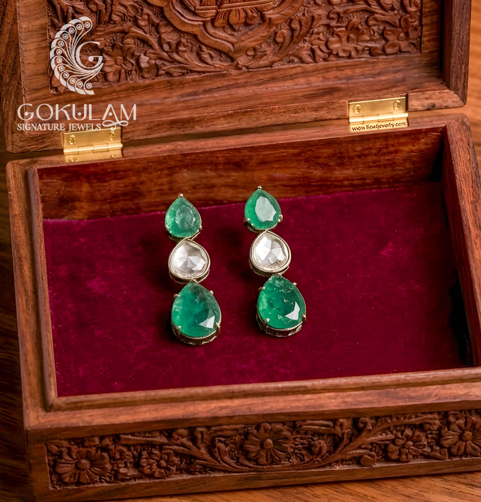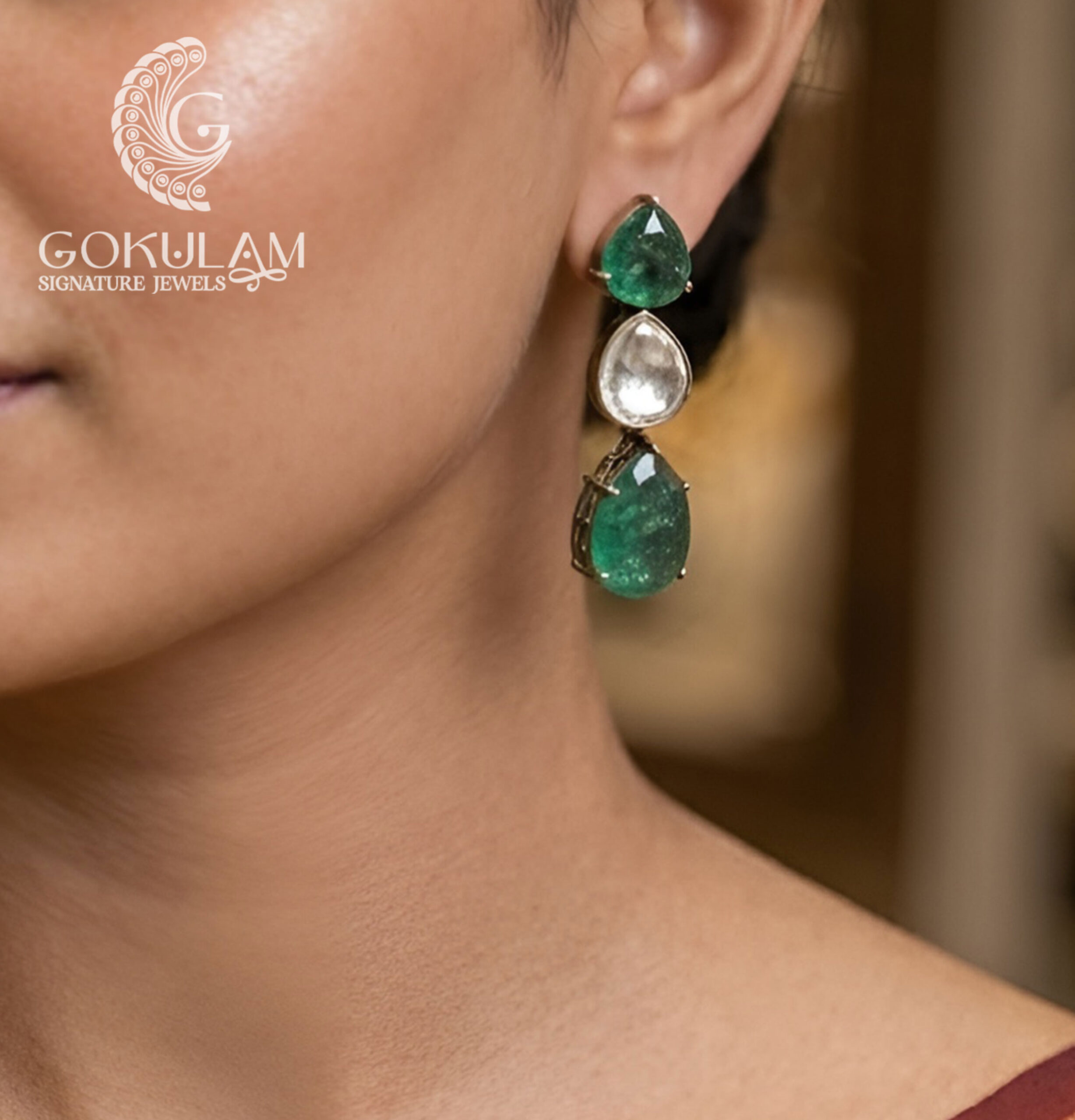 The Emerald Teardrop Victorian Drop Earrings showcase a graceful vertical design crafted with luminous emerald stones and sparkling crystal accents. Each earring features a layered teardrop arrangement that enhances its elegant silhouette and creates a sophisticated look. The balanced combination of vibrant green stones and clear crystals reflects timeless Victorian-inspired artistry. Ideal for weddings, festive celebrations, and elegant gatherings, these earrings complement traditional and fusion outfits beautifully, adding a refined touch of luxury and charm to your jewelry collection.
