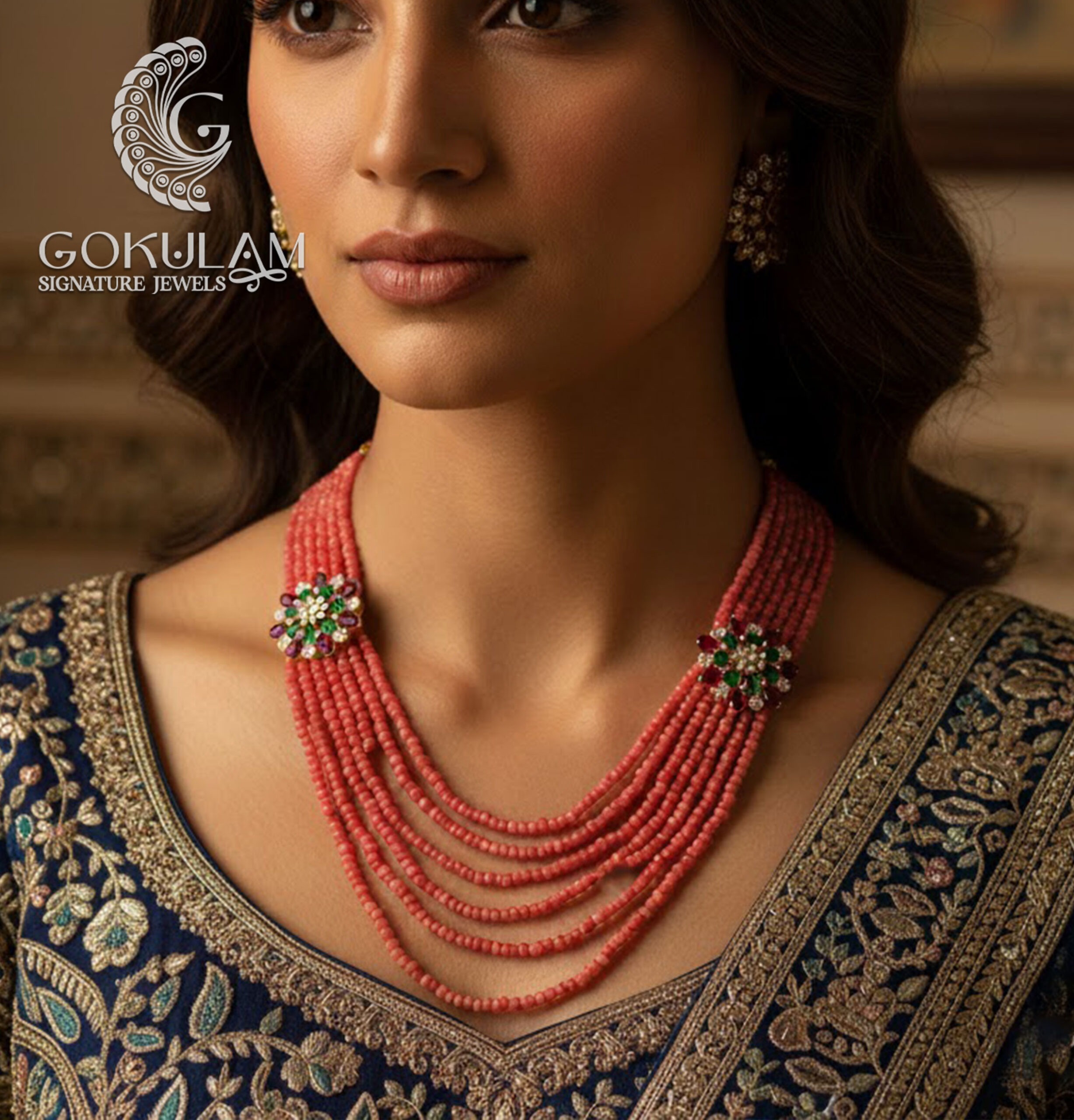 Graceful layered coral bead necklace with floral gemstone connectors, adding a vibrant and elegant touch perfect for festive wear and traditional occasions.