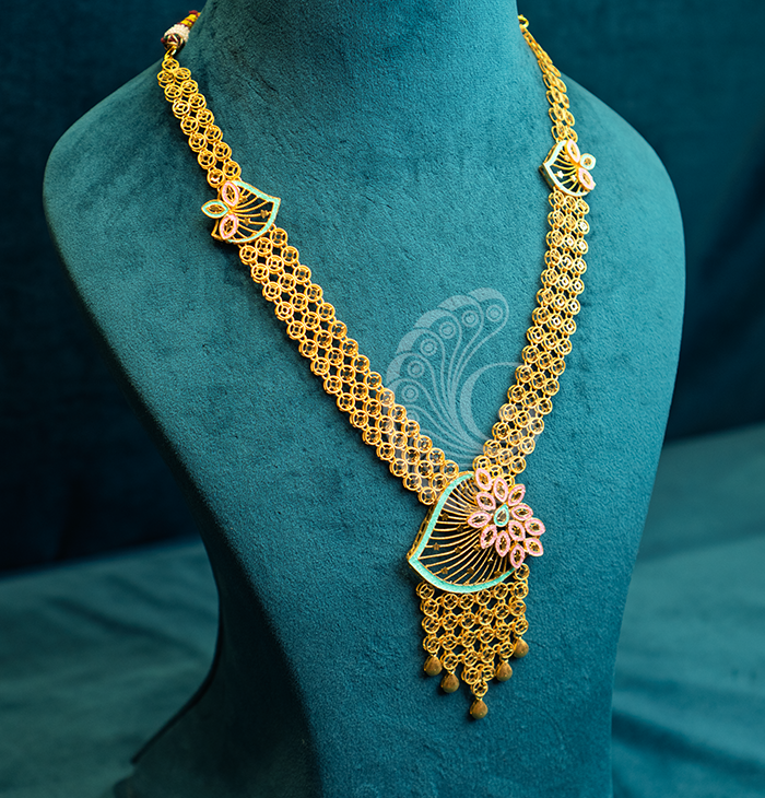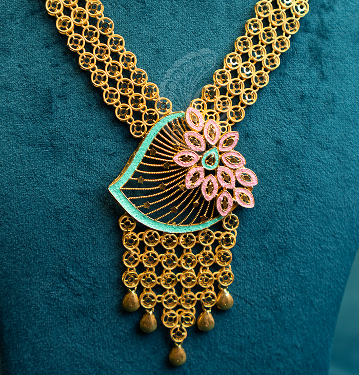Elegant long necklace featuring a floral pendant, intricate filigree chain, and graceful drops, perfect for festive wear and special occasions.