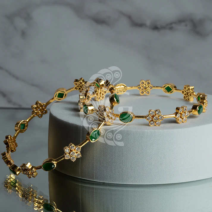 Elegant gold bangles adorned with vibrant green stones and sparkling floral accents, perfect for festive and traditional occasions.
