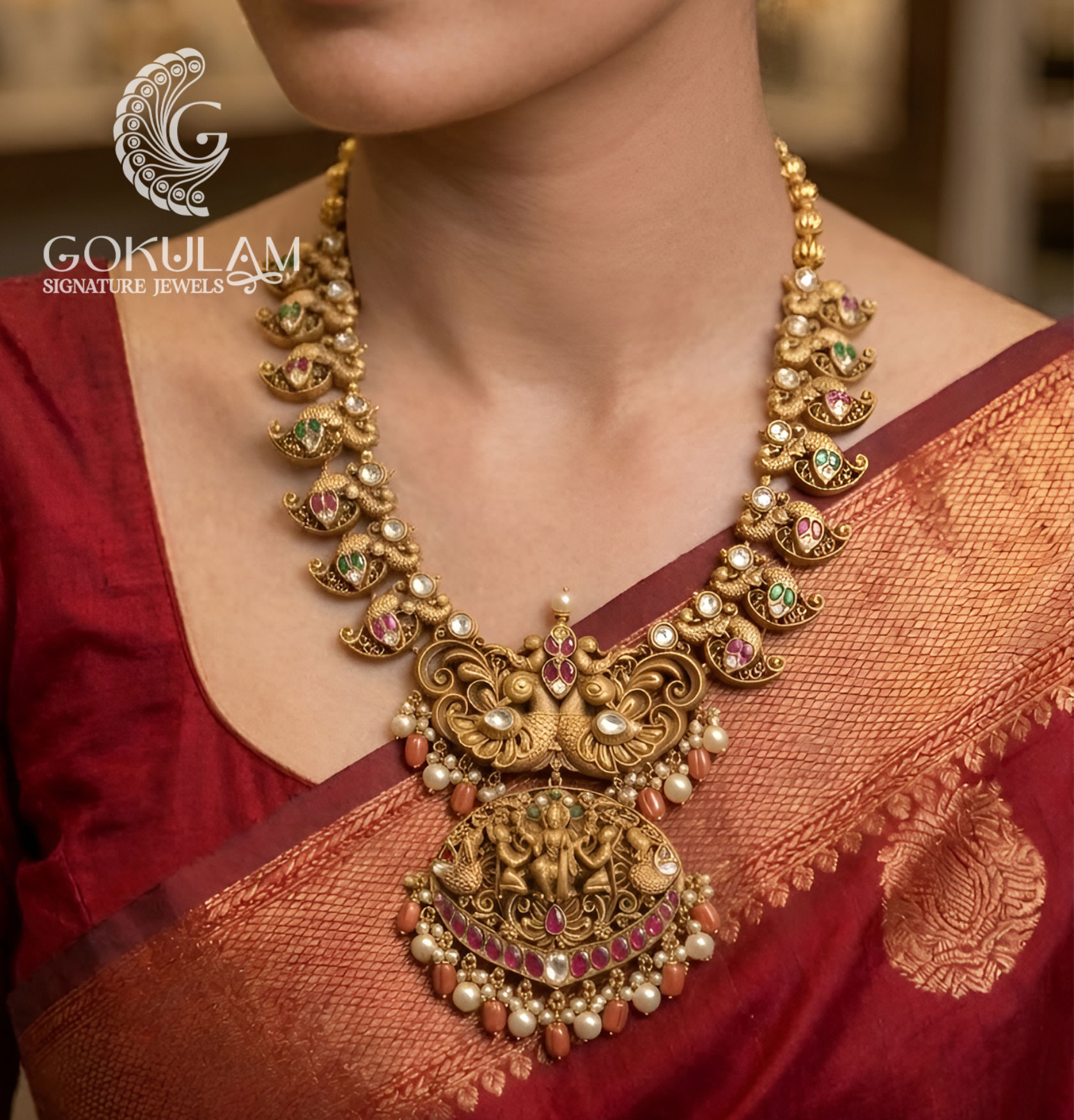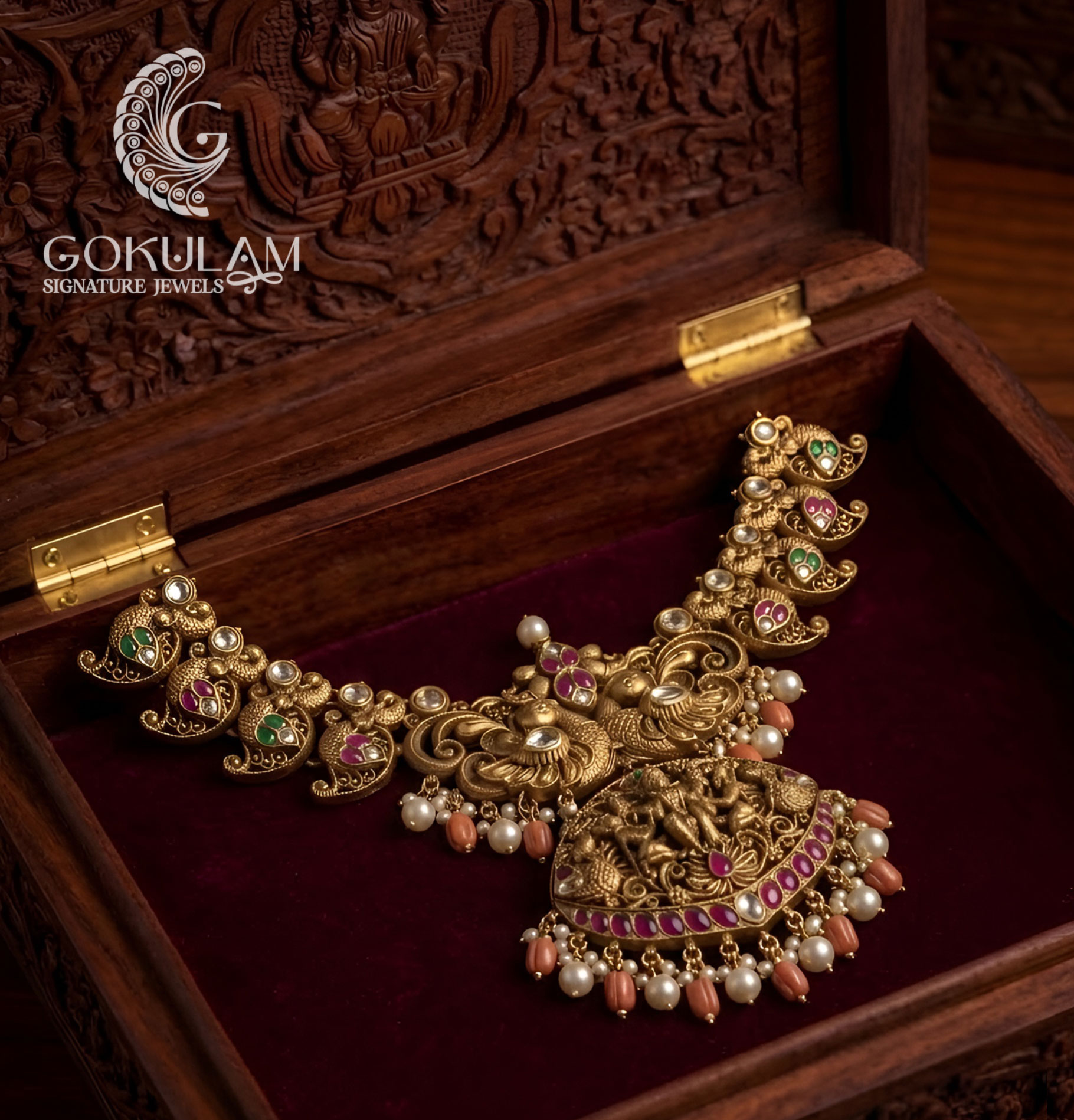 The Krishna Radha Nakshi Temple Necklace is a beautifully crafted piece inspired by traditional temple jewelry artistry. At its center lies an intricate Radha Krishna motif symbolizing divine love and devotion. The necklace is adorned with detailed nakshi work, vibrant ruby and emerald accents, and delicate pearl and coral bead drops that add movement and elegance. Perfect for weddings, religious ceremonies, and grand celebrations, this necklace enhances traditional attire with its sacred symbolism and rich heritage design.