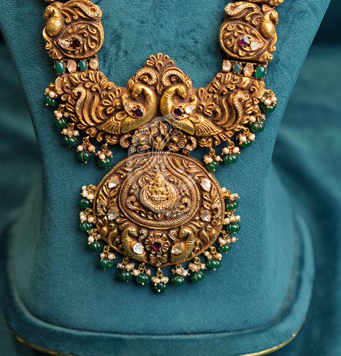 This Lakshmi Coin Pendant Haram beautifully showcases traditional temple jewellery craftsmanship with a series of intricately designed coin motifs leading to a grand pendant. The detailed Lakshmi carving symbolises prosperity and grace, while the elegant drops add richness and movement. Perfect for weddings, festive celebrations, and cultural occasions, it pairs beautifully with silk sarees and traditional attire. This haram reflects timeless heritage and elegance, making it a stunning statement piece for special moments.