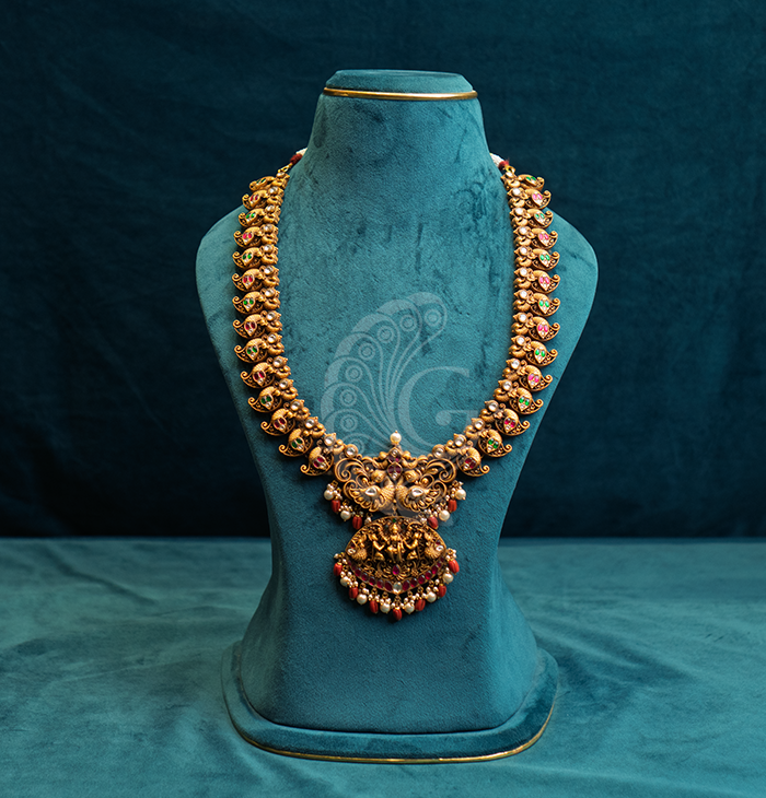 This Lakshmi Peacock Temple Necklace is a beautifully crafted piece inspired by traditional temple jewelry artistry. Featuring intricate peacock motifs along the chain and a detailed Lakshmi pendant, it reflects cultural richness and elegance. The vibrant accents and decorative drops add movement and charm, making it perfect for weddings, festive celebrations, and ceremonial occasions. Designed to complement silk sarees and ethnic attire, this necklace symbolizes prosperity and heritage, making it a timeless statement piece for special moments.