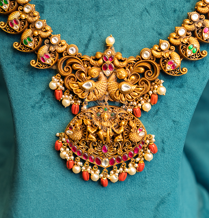 Elegant Lakshmi peacock temple necklace featuring intricate motifs, vibrant accents, and decorative drops, perfect for weddings and festive occasions.