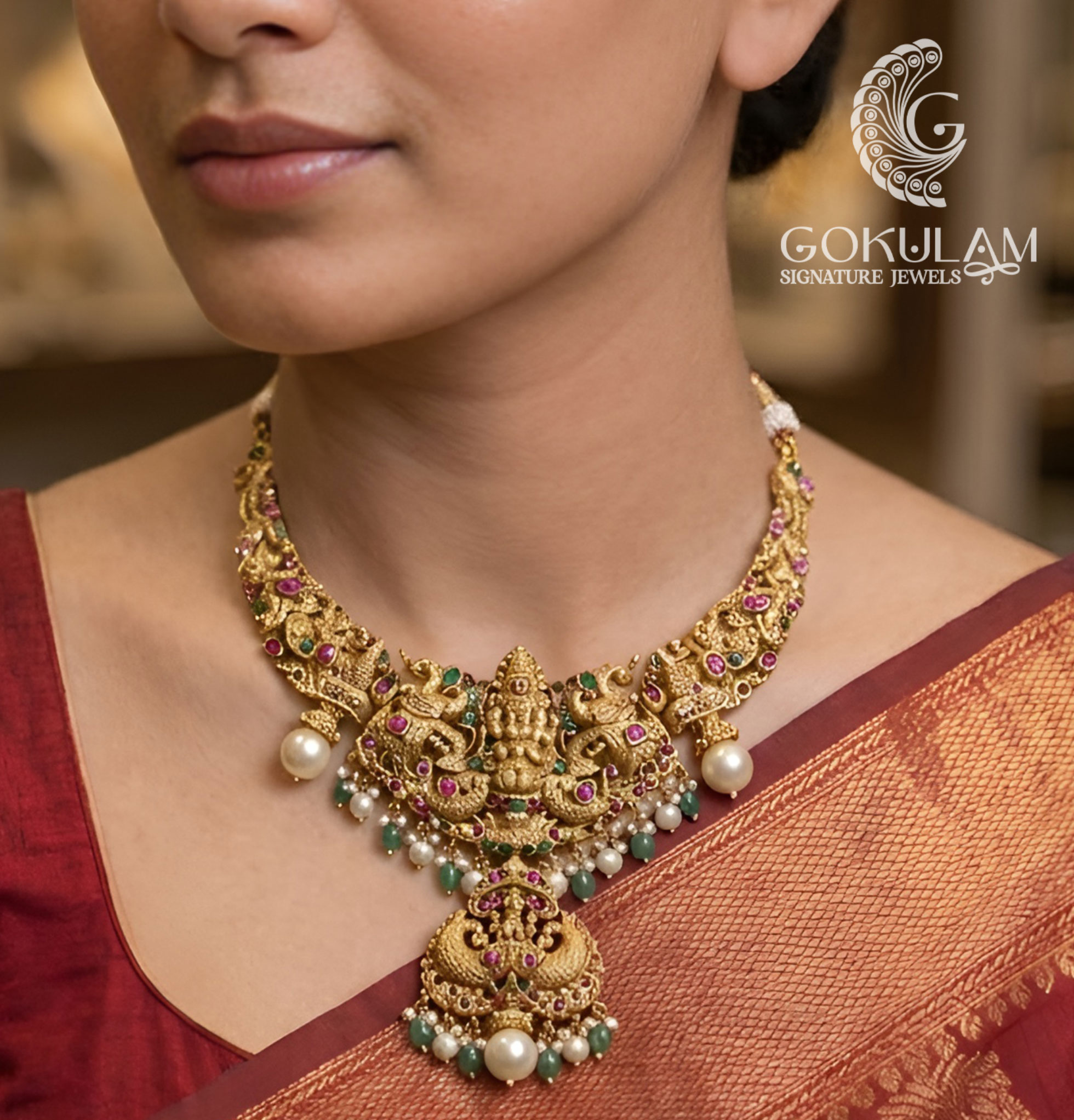 This Lakshmi Temple Pendant Necklace is a beautiful representation of traditional temple jewelry artistry. Featuring an intricately carved Lakshmi motif with a grand pendant and decorative drops, it radiates cultural richness and elegance. The detailed craftsmanship and subtle color accents make it perfect for weddings, festive celebrations, and ceremonial occasions. Designed to complement silk sarees and ethnic attire, this necklace symbolizes prosperity and grace, making it a timeless statement piece for special and memorable moments.