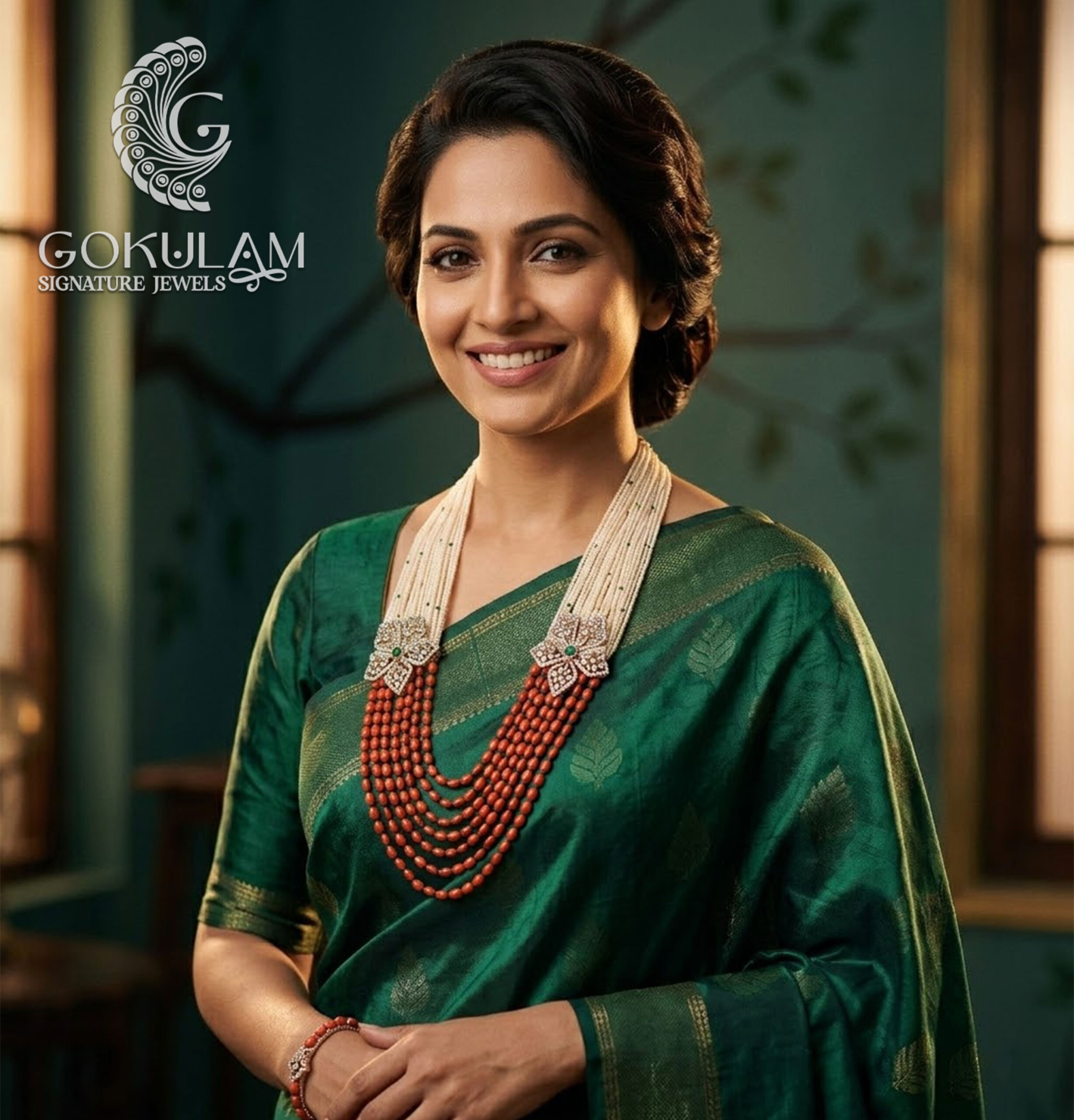 Elegant multi-layer necklace featuring coral beads with diamond-studded connectors, creating a bold and graceful statement ideal for festive and traditional styling.