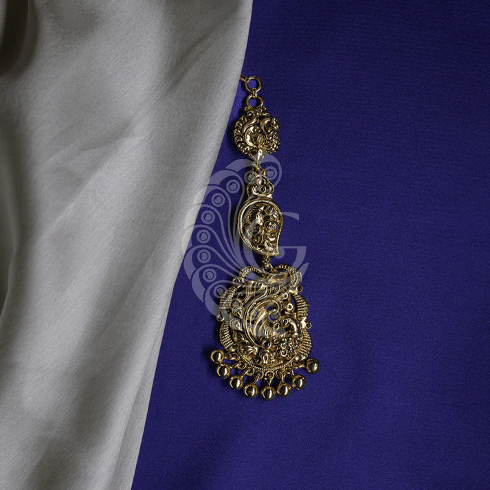 The Nakas Temple Mang Tika showcases exquisite craftsmanship inspired by classic South Indian temple jewelry. Designed with detailed nakas carvings and a rich antique gold finish, this piece reflects heritage and cultural grace. The elegant drop element enhances the forehead beautifully, adding a regal and devotional touch. Ideal for brides, weddings, and festive celebrations, it pairs perfectly with silk sarees and traditional ensembles, completing the look with timeless charm and spiritual significance.