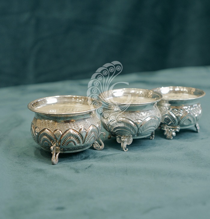 Beautifully crafted silver bowl set with embossed detailing and elegant tripod legs, ideal for pooja offerings, serving dry fruits, or decorative display.