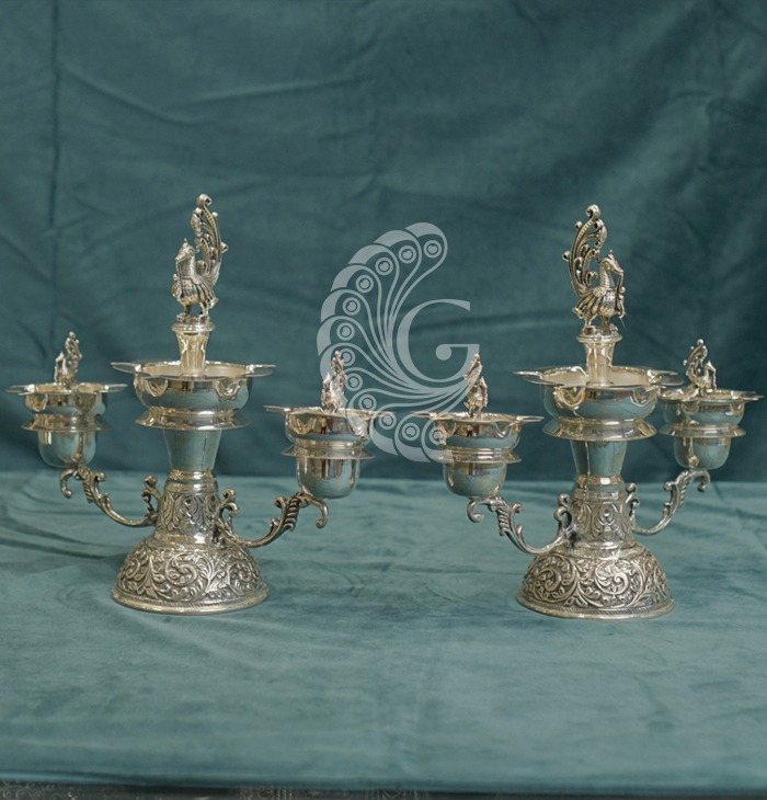 Ornate multi-wick silver deepam pair featuring peacock finials, side lamp holders, and an engraved base, ideal for grand pooja rituals.