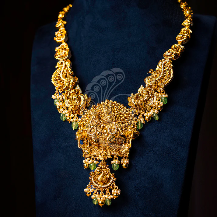 Traditional haaram featuring Radha Krishna motif with intricate temple detailing, offering a divine heritage look perfect for weddings and festive occasions.