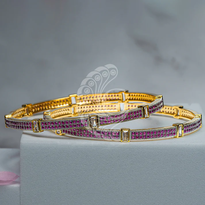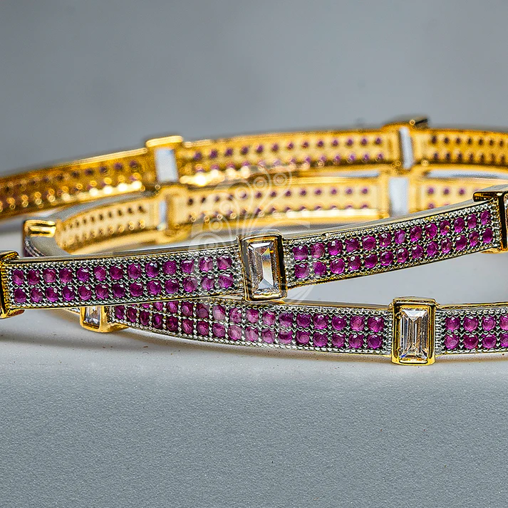 These Ruby Tennis Style Bangles showcase a refined and contemporary design highlighted by neatly set ruby-toned stones in a sleek linear pattern. Their elegant structure offers a sophisticated sparkle, making them perfect for festive gatherings, parties, and modern celebrations. Crafted for both comfort and style, they pair beautifully with ethnic as well as fusion outfits. The minimalist yet luxurious appeal makes these bangles a timeless accessory, ideal for adding a graceful pop of color to your jewelry collection.