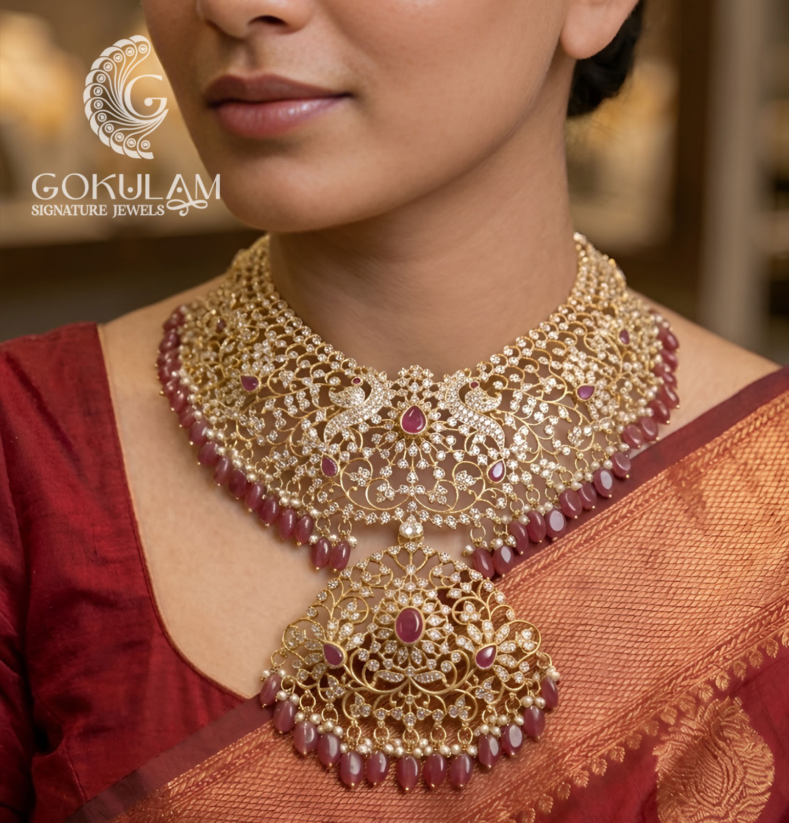 Luxurious filigree necklace featuring intricate lattice design, ruby accents, and grand pendant drops, perfect for weddings and evening celebrations.
