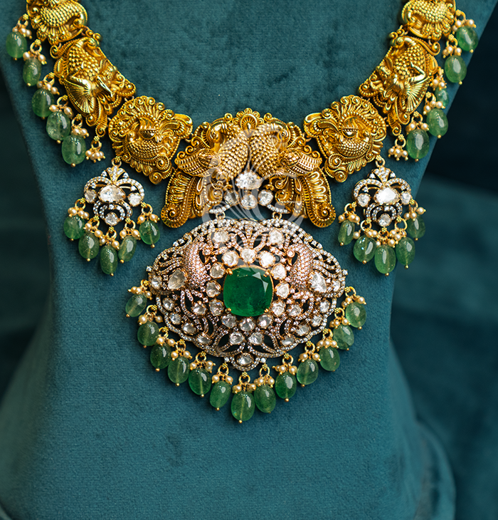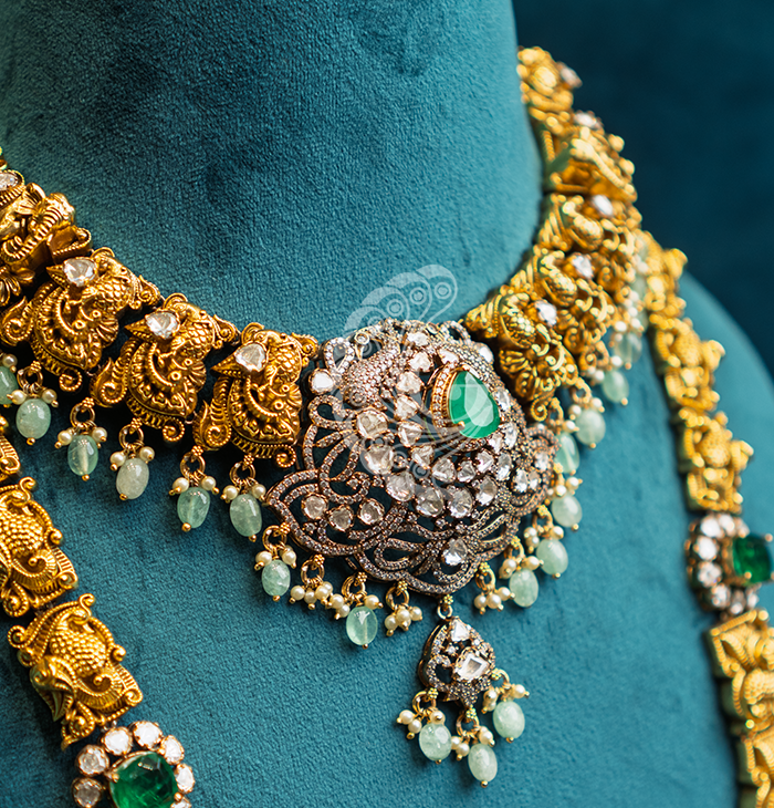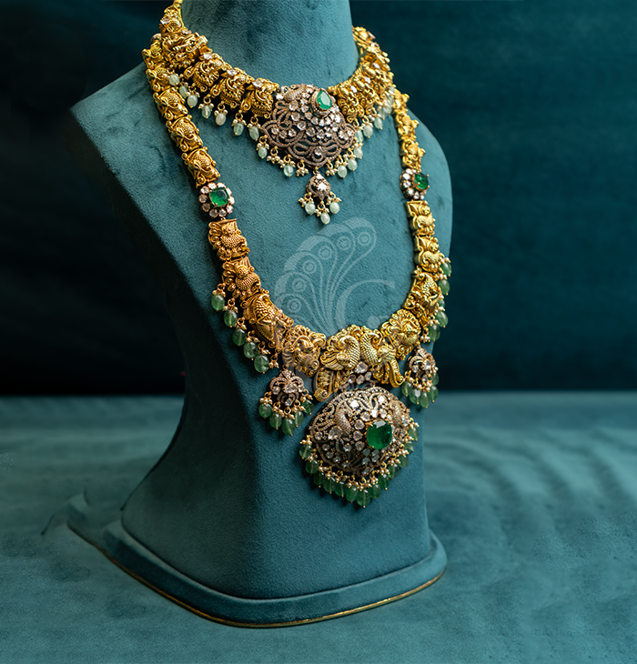 This Royal Temple Bridal Jewelry Set is a magnificent ensemble crafted to create a complete and regal bridal look. Featuring intricately designed layered necklaces, detailed temple motifs, and matching jhumkas and bangles, it reflects timeless heritage and elegance. The subtle green accents enhance its richness, making it perfect for weddings, receptions, and ceremonial occasions. Designed to complement silk sarees and traditional bridal attire, this set embodies grace, prosperity, and cultural beauty, making it a statement collection for unforgettable celebrations.