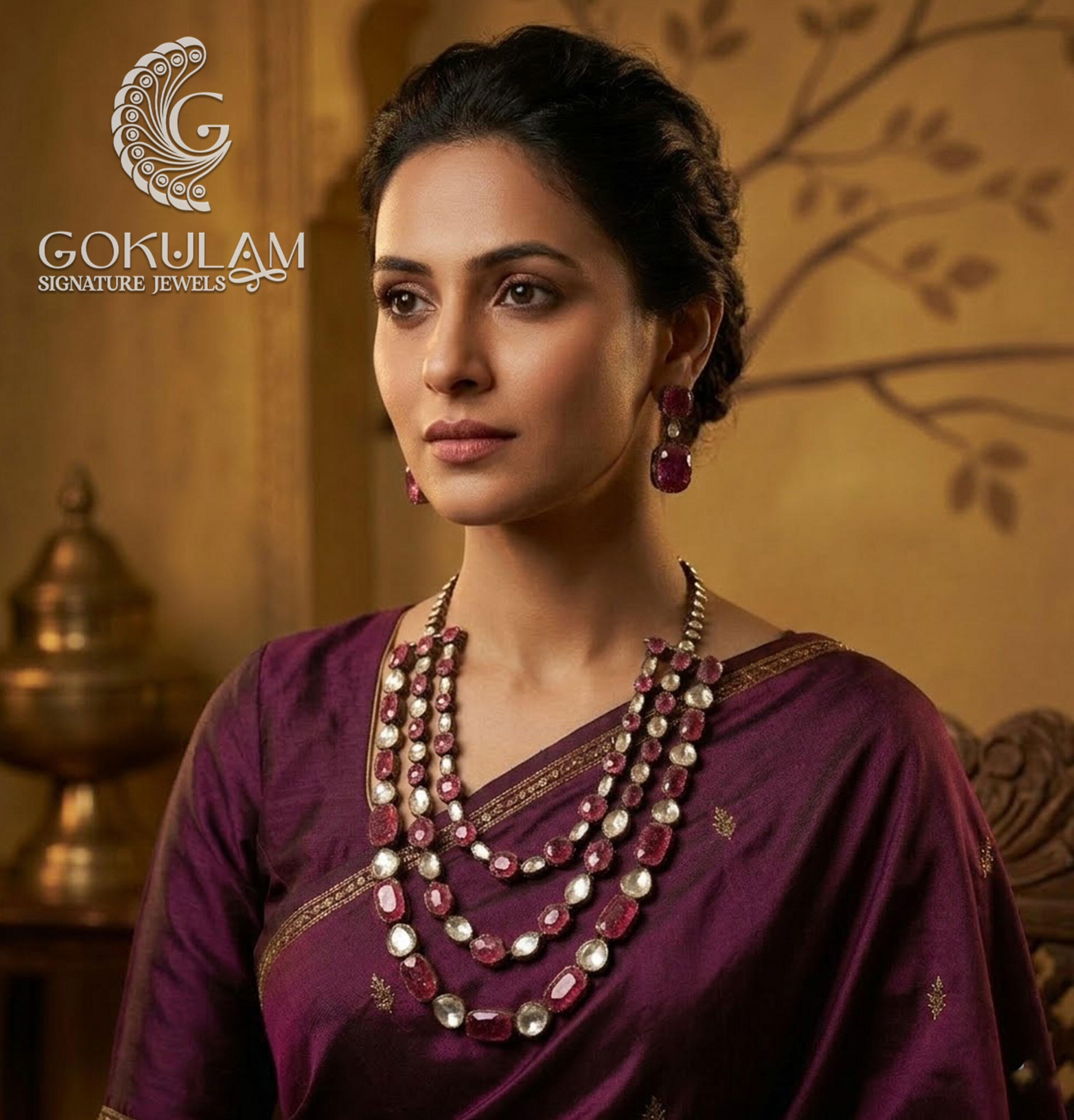 Stylish multi-layer necklace featuring bold ruby-toned stones with elegant arrangement, offering a contemporary yet traditional look for festive and special occasions.