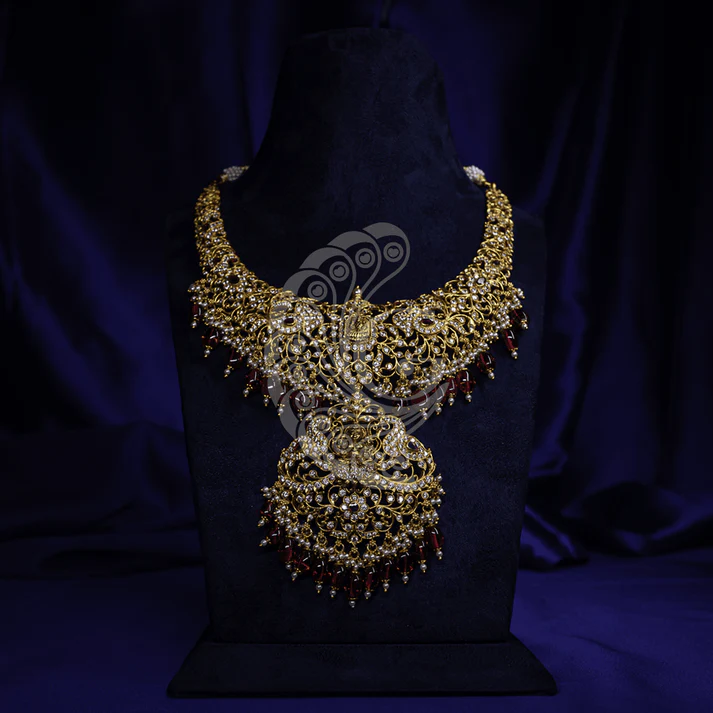 The Ruby Lakshmi Temple Necklace is a stunning expression of devotion and classical craftsmanship. Featuring the divine Goddess Lakshmi at its center, this necklace symbolizes prosperity, grace, and spiritual abundance. The antique gold-tone base is beautifully enriched with radiant ruby-red highlights, adding depth and royal appeal to the design. Crafted in a traditional temple style, it pairs effortlessly with silk sarees and bridal ensembles, making it an ideal choice for weddings, festive occasions, and religious ceremonies.