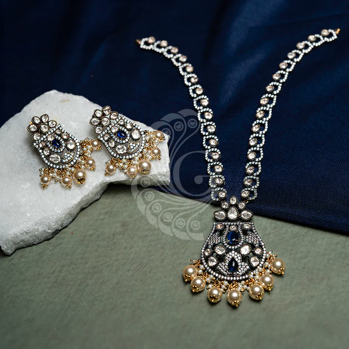 The Victorian Necklace Set showcases timeless elegance through ornate craftsmanship inspired by classic Victorian jewellery. Featuring intricate metalwork and carefully placed stones, the necklace creates a bold yet refined statement. Designed to sit gracefully on the neckline, it is ideal for weddings, receptions, and festive celebrations. Paired with matching earrings, this set blends heritage aesthetics with contemporary charm, offering a luxurious accessory that complements traditional and fusion outfits effortlessly.