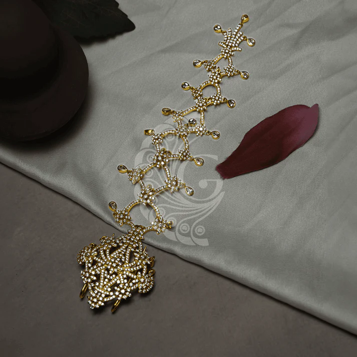 The White Stone Bridal Jhadanagam is a stunning hair accessory designed to elevate traditional bridal looks. Adorned with shimmering white stones set on a rich gold base, this jhada beautifully complements braided hairstyles. Its intricate craftsmanship and radiant finish create a regal appearance, making it ideal for weddings and grand celebrations. Lightweight yet eye-catching, it adds a graceful sparkle and completes the bridal ensemble with timeless elegance and cultural significance.