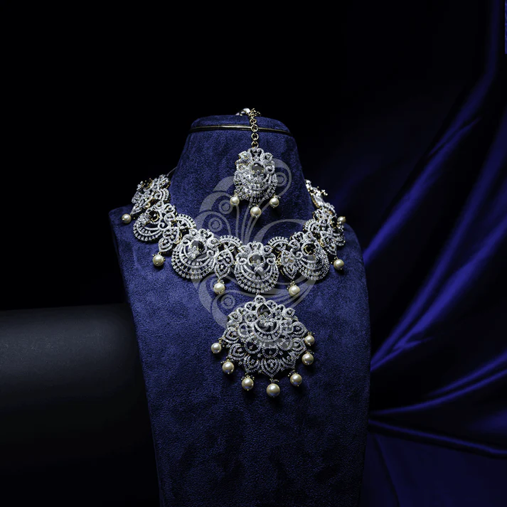 Elegant white stone necklace set crafted with refined detailing, offering timeless charm and graceful brilliance for weddings, festive wear, and celebrations.