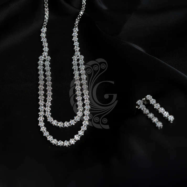 Elegant double-step zirconia necklace featuring layered brilliance and refined detailing, designed to elevate festive attire, weddings, and sophisticated celebration looks.